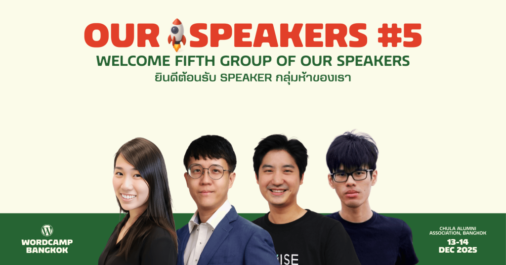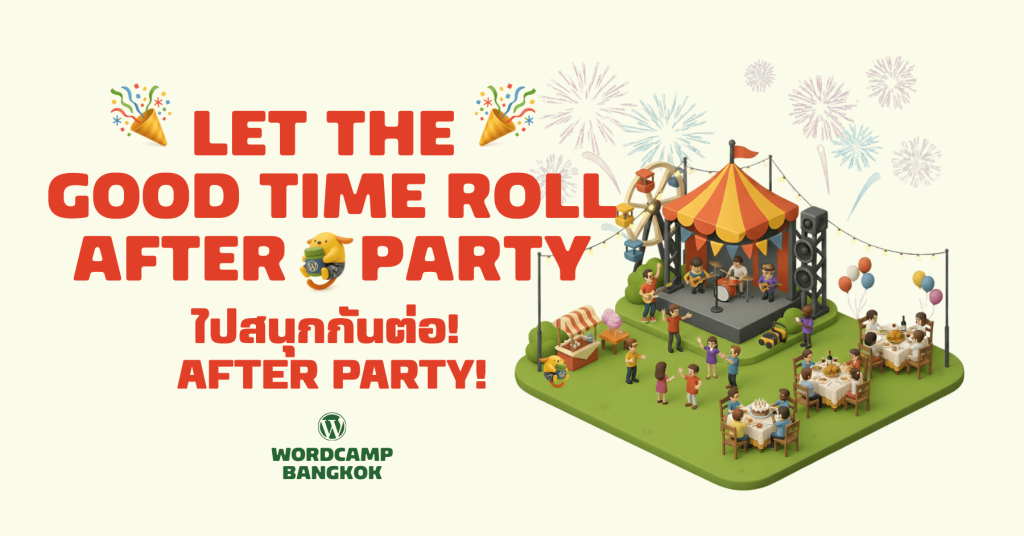 - ไปสนุกกันต่อ! WordCamp Bangkok 2025 After Party!ฟังสัมมนาจนสมองแน่น… ได้เวลามาปลดปล่อยความสนุกกันแล้ว! เตรียมตัวให้พร้อมสำหรับงาน After Party ที่ทุกคนตั้งตารอ คืนที่เราจะได้ Networking พบปะผู้คนและร่วมส่งท้าย WordCamp Bangkok 2025 ไปด้วยกัน! ไฮไลท์ในงานที่ไม่ควรพลาด สิ่งสำคัญที่ต้องจำ! การเข้างานฟรี! แต่ต้องมี Badge (ป้ายชื่อ) เท่านั้น! โปรดทราบว่างาน After Party ฟรีสำหรับผู้เข้าร่วมงาน WordCamp… Read more: ไปสนุกกันต่อ! WordCamp Bangkok 2025 After Party!